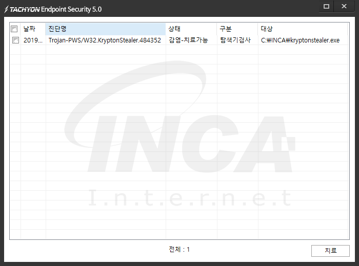 상기 악성코드는 잉카인터넷 안티바이러스 제품 TACHYON Internet Security 5.0에서 진단 및 치료가 가능하다.