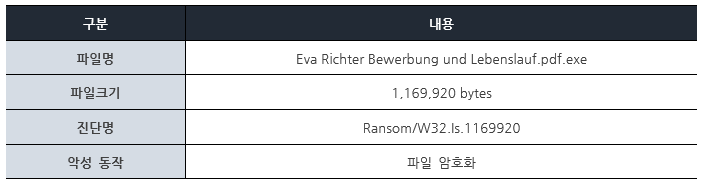 Is 랜섬웨어는 실행파일을 Eva Richter의 이력서 pdf파일로 위장하여 유포된 것으로 알려져 있다.