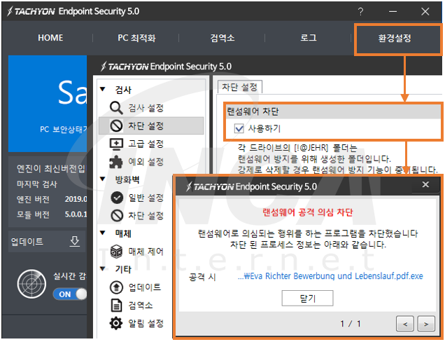 TACHYON Endpoint Security 5.0에서 랜섬웨어 차단 기능을 이용하면 의심되는 파일의 암호화 행위를 차단할 수 있다.