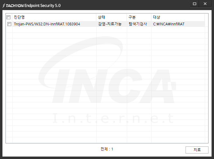 상기 악성코드는 잉카인터넷 안티바이러스 제품 TACHYON Internet Security 5.0에서 진단 및 치료가 가능하다.
