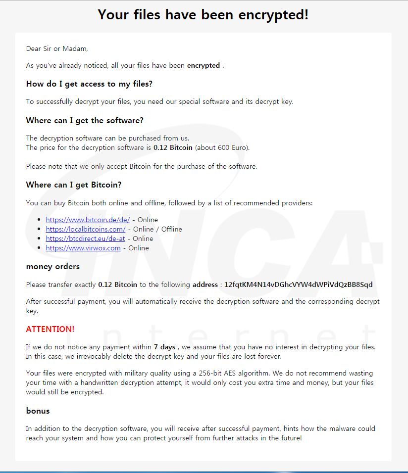 랜섬노트는 ‘Wo_sind_meine_Dateien.HTML’ 라는 파일명으로 생성되며, 한국어로 번역하면 ‘내 파일은 어디에 있습니까’라는 의미이다. 독일에서 유포되어 랜섬노트 또한, 독일어로 제작되어 있다.