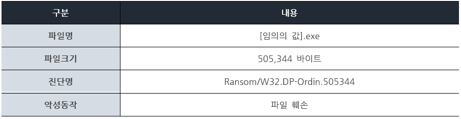 하지만 최근 등장한 Ordinypt 랜섬웨어는 파일에 비정상적인 데이터를 삽입하여 훼손한 뒤, 거짓으로 복구를 약속하며 금전을 요구한다. 이러한 모습의 악성코드는 추후에 지속적으로 등장할 수 있기에 주의가 필요하다.