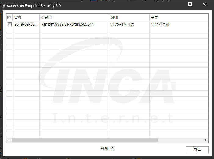 상기 악성코드는 잉카인터넷 안티바이러스 제품 TACHYON Internet Security 5.0 에서 진단 및 치료가 가능하다.