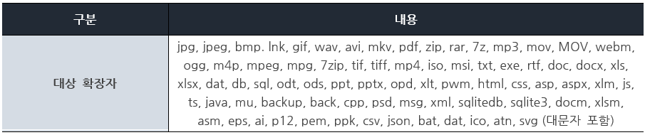 훼손 대상 파일의 확장자 명은 아래의 표와 같다.