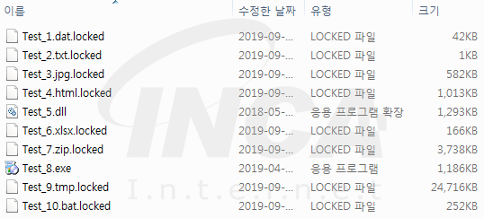 다음으로 아래 [표 1]의 확장자를 대상으로 파일암호화를 진행하며, 암호화된 파일의 확장자로 [그림 6]과 같이 .locked 확장자명을 덧붙인다.