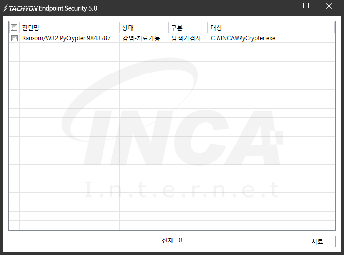 상기 악성코드는 잉카인터넷 안티바이러스 제품 TACHYON Endpoint Security 5.0에서 진단 및 치료가 가능하다.