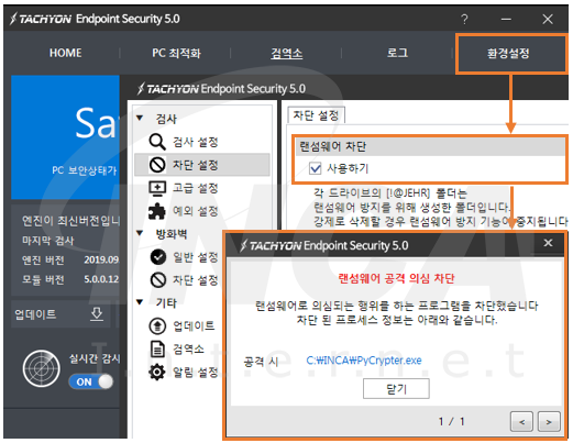 TACHYON Endpoint Security 5.0에서 랜섬웨어 차단 기능을 이용하면 의심되는 파일의 암호화 행위를 차단할 수 있다.