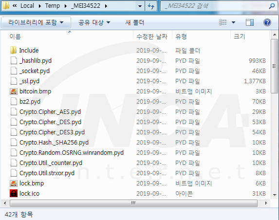파일 암호화를 수행하기 전, 현재 실행 중인 악성 프로세스의 환경 변수 중 '_MEIPASS2'의 존재여부를 확인한다. 해당 변수를 전달받지 못했다면 '%Temp%' 경로에 'MEI+5자리 숫자'로 시작하는 무작위 폴더를 생성하고 악성 행위에 사용되는 Python 모듈을 드랍 한다.