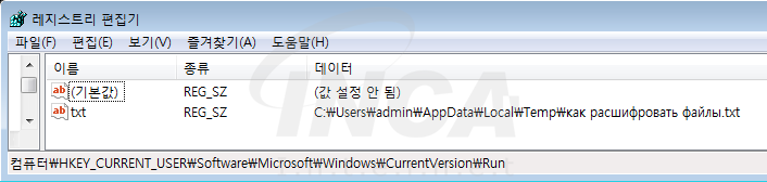 암호화 완료 후에 랜섬노트를 ‘HKEY_CURRENT_USER\Software\Microsoft\Windows\CurrentVersion\Run’ 레지스트리에 ‘txt 라는 이름으로 등록하여 시스템 재부팅 후에도 자동으로 실행될 수 있도록 설정한다.