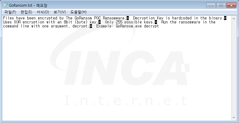 9월 말 발견된 Go 랜섬웨어는 암호화 후 ‘.gore’ 라는 확장자 명을 덧붙인다. 또한 [그림 4] 와 같이 ‘GoRansom.txt’ 라는 이름의 랜섬노트를 사용하여 복호화 방법을 안내한다. ‘txt, rtf, png, jpg’등 주로 문서파일이나 사진파일을 암호화 대상으로 하는 것으로 알려졌다. 아직 구체적인 피해사례가 밝혀지지 않았지만, 최근에 발견된 랜섬웨어 이므로 사용자들은 항상 주의를 요한다.
