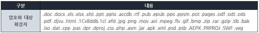 사용자 PC를 탐색하여 아래 [표 1] 에 해당하는 확장자를 대상으로 암호화를 진행한다.