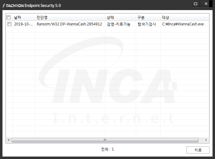 상기 악성코드는 잉카인터넷 안티바이러스 제품 TACHYON Internet Security 5.0 에서 진단 및 치료가 가능하다.