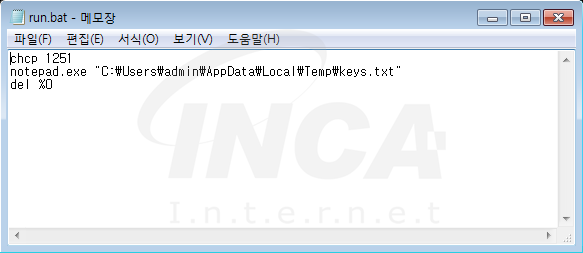 해당 파일의 내용을 살펴보면, ‘run.bat’ 파일은 ‘notepad’를 사용하여 ‘keys.txt’ 파일을 실행하는 배치파일이다.