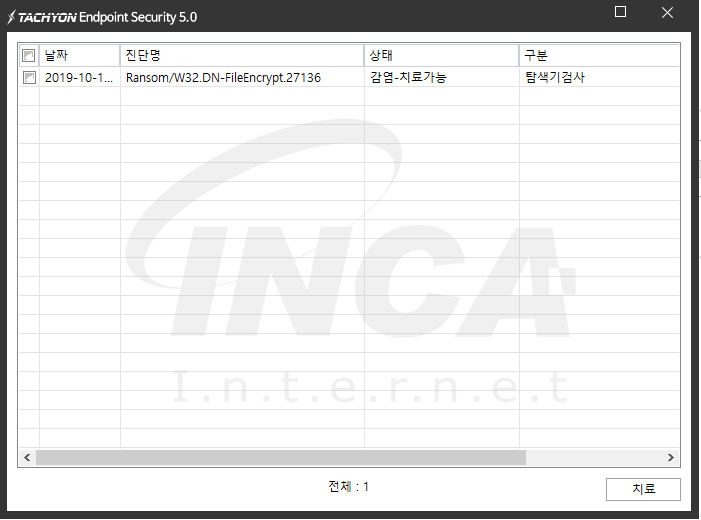 상기 악성코드는 잉카인터넷 안티바이러스 제품 TACHYON Endpoint Security 5.0에서 진단 및 치료가 가능하다.