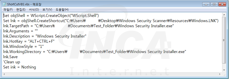“ShortCutVBS.exe” 는 ‘%Documents%’ 경로 ‘Test_Folder’ 에 랜섬웨어 바로가기 링크 생성 시도하지만 경로에 차이가 있어 실패한다.