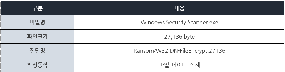 최근, ‘Windows Security Scanner’를 가장한 랜섬웨어가 등장하였다. 이는 이메일을 통해 유포되었으며, Zip 파일이 첨부되어 압축을 해제하면 실행파일이 있고, 숨김 속성으로 ‘Resource’ 폴더가 나타난다. 해당 실행파일을 실행하면 ‘Resource’ 폴더 내에 숨김 파일들이 실행되며, 스캐너 로딩 이미지를 통해 정상 파일처럼 보이도록 하지만 악성 동작을 수행한다.