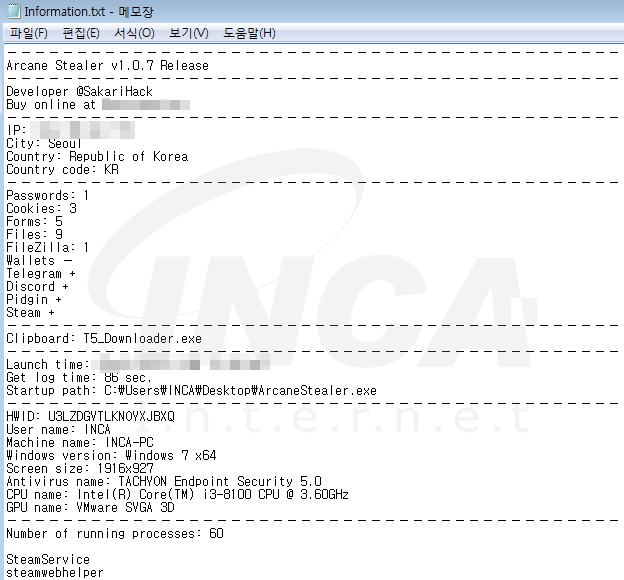 시스템 정보를 추가적으로 수집한 뒤, 앞서 수집한 정보와 함께 취합하여 “Information.txt”에 기록한다. [그림 7]의 상단부분을 확인하면 “Arcane Stealer”라는 이름과 함께 버전명을 확인할 수 있다.