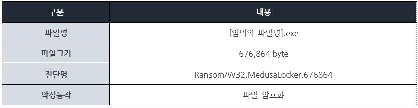 이번 보고서에서 알아 본 MedusaLocker 랜섬웨어는 아직 유포 경로나 국내 피해사례가 알려지지 않았지만, 최근에 발견되고 있는 만큼 사용자들은 항상 주의를 기울일 필요가 있다.