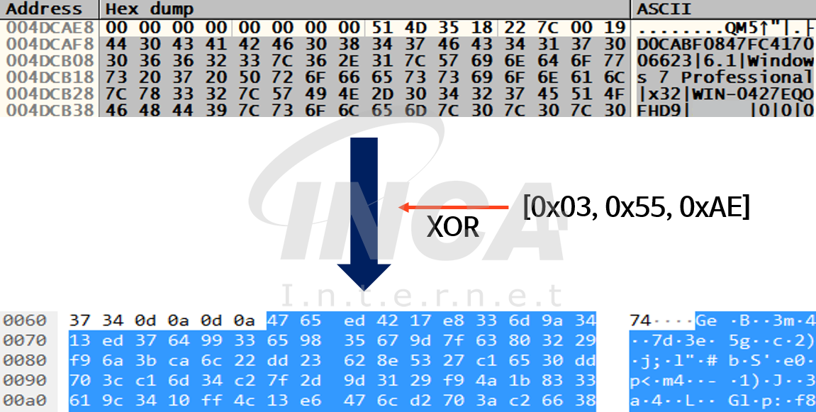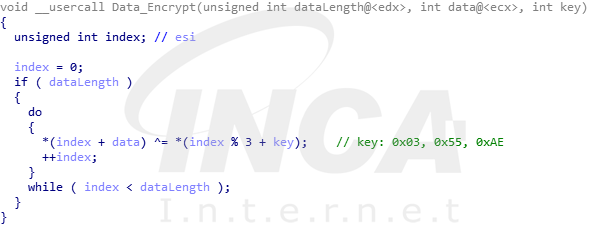 만약, 정상적으로 연결된다면 3바이트 키(0x03, 0x55, 0xAE)를 이용하여 수집한 정보를 1바이트씩 암호화한 후 C&C 서버로 전송한다.
