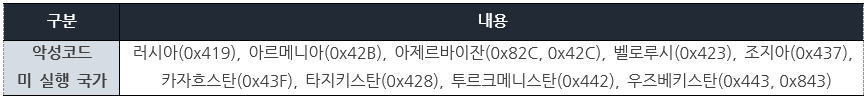 사용자 PC를 탐색하여 [표 1]에 해당하는 언어를 사용 중일 경우에는 해당 악성코드를 실행하지 않는다.