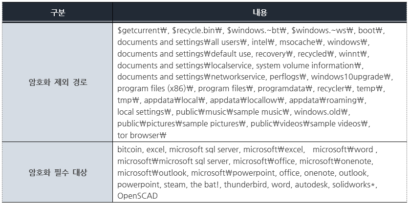복사 후 실행된 “FuxSocy” 랜섬웨어는 사용자 시스템의 파일을 검색한 후, 아래 [표 1]의 암호화 제외 경로 및 필수 대상 리스트와 비교하여 조건에 일치하는 파일을 암호화한다.