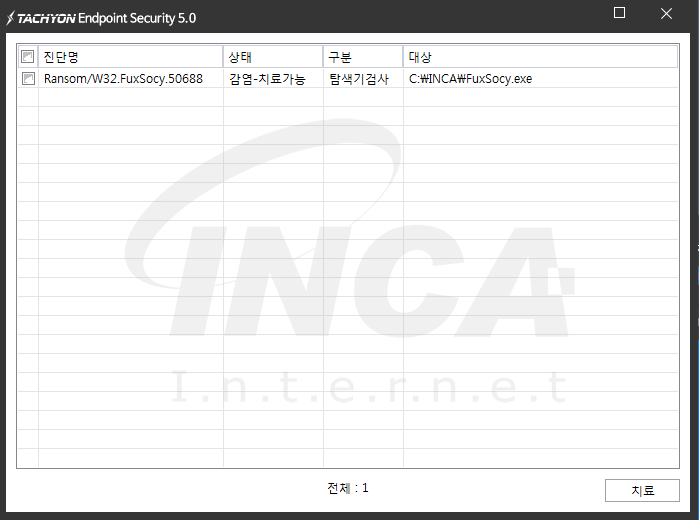 상기 악성코드는 잉카인터넷 안티바이러스 제품 TACHYON Endpoint Security 5.0에서 진단 및 치료가 가능하다.
