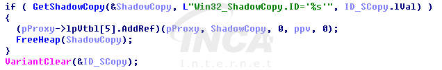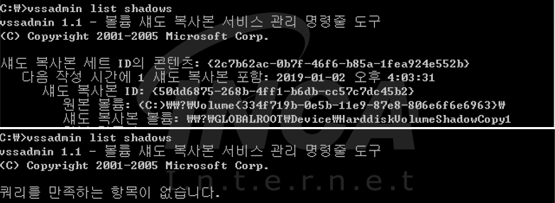 “FoxSocy” 랜섬웨어 실행 시, WQL(WMI Query Language)을 이용하여 윈도우 운영체제 관리 도구인 WMI에서 볼륨 섀도우 복사본의 정보를 검색하고 모두 삭제한다.