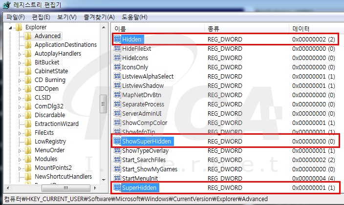 아래 [그림 5]처럼 레지스트리 설정을 통해 숨김 파일이 사용자에게 보이는 것을 방지한다.