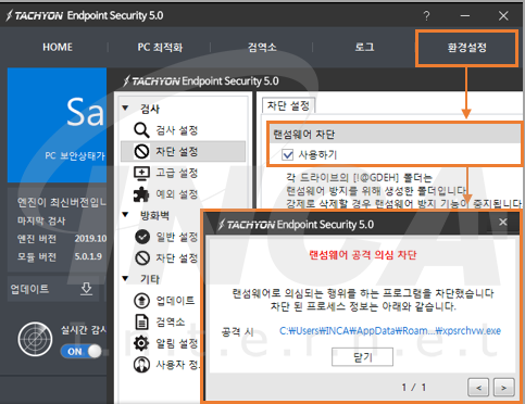 TACHYON Endpoint Security 5.0에서 랜섬웨어 차단 기능을 이용하면 의심되는 파일의 암호화 행위를 차단할 수 있다.