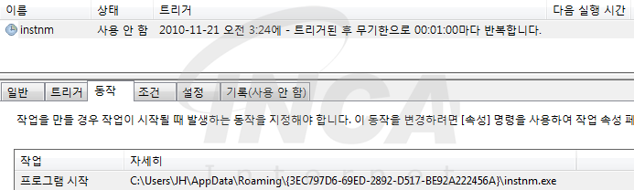 악성 행위를 유지하기 위해 앞서 복사한 파일을 작업 스케줄러에 등록하여 지속적으로 실행되도록 설정한다.
