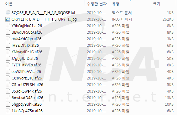 암호화 된 파일은 [그림 7]과 같이 ‘[랜덤한 10글자 파일명].[랜덤한 4글자 확장자]’의 형태로 파일이름을 전부 변형시키고 확장자를 덧붙인다.