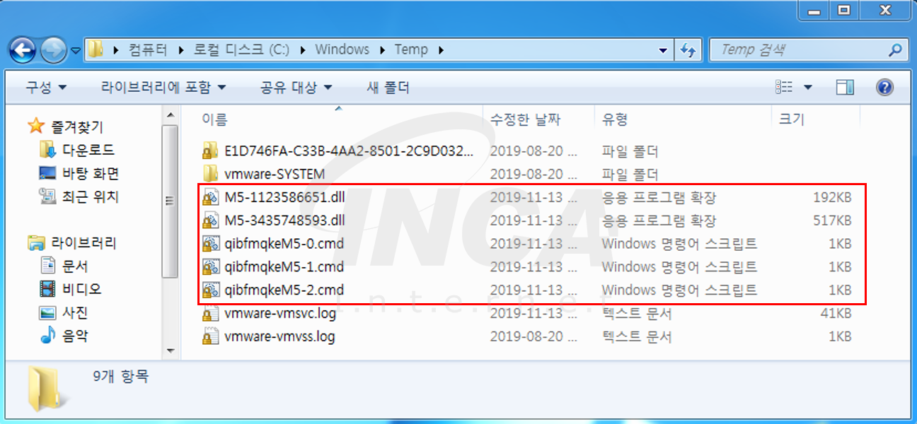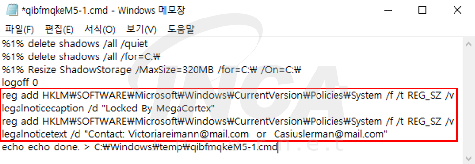 MegaCortex가 실행되면 3개의 배치 파일(.cmd)과 2개의 dll 파일을 생성하여 파일 암호화, 로그인 경고 메시지 작성, 복구 무력화 등의 행위를 수행한다.