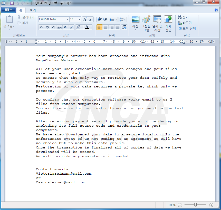 이번 보고서에서는 “MegaCortex” 랜섬웨어의 동작에 대해 알아보고자 한다.