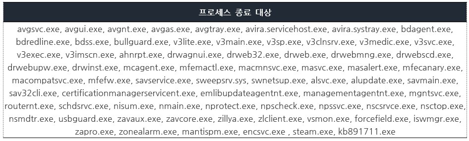 프로세스 종료 대상은 1118개이며, 종료 대상 중에서 종료되는 백신은 AVG, Avira, BitDefender, BullGuard, v3, McAfee, Dr.WEB, Sophos, Symantec이다.