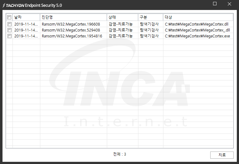 상기 악성코드는 잉카인터넷 안티바이러스 제품 TACHYON Internet Security 5.0에서 진단 및 치료가 가능하다.