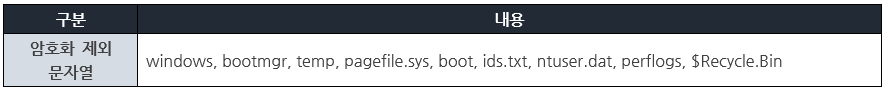 [표 1] 과 비교하여 암호화 제외 문자열이 들어간 폴더 및 파일을 제외하고, 모든 확장자를 대상으로 암호화를 진행한다.