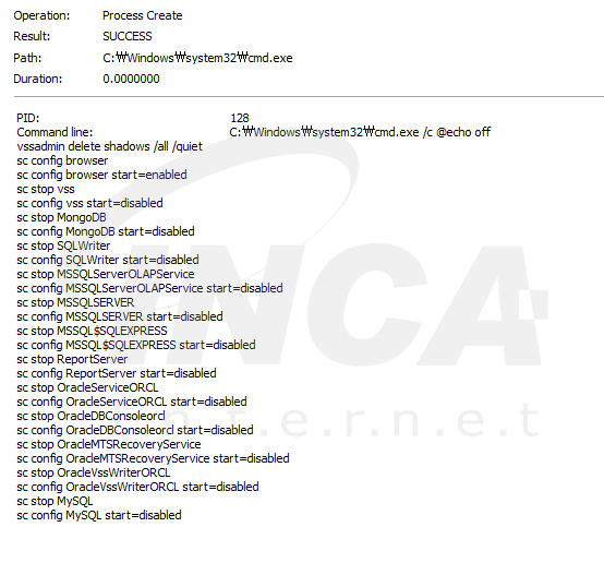 레지스트리 변경 후에 cmd명령을 통해 볼륨 쉐도우 복사본 삭제 명령어를 실행시키고, 데이터베이스와 관련된 특정 서비스를 비활성화 시킨다. 이는 사용자가 시스템 복원을 통해 암호화 이전 상태로 되돌리는 것을 막고, 암호화 작업을 좀 더 수월하게 진행하기 위한 동작으로 보인다.