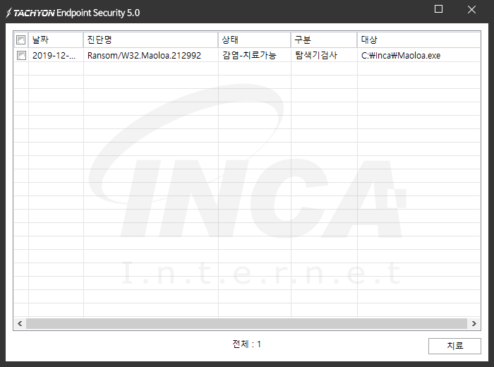 상기 악성코드는 잉카인터넷 안티바이러스 제품 TACHYON Internet Security 5.0 에서 진단 및 치료가 가능하다.