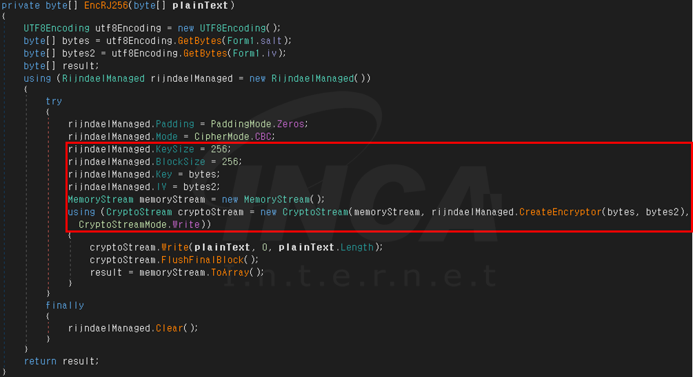 암호화 대상 파일 스캔 및 RijndaelManaged 클래스에 사용할 값이 모두 설정되면 AES 256 알고리즘을 사용하여 파일 암호화를 진행한다.