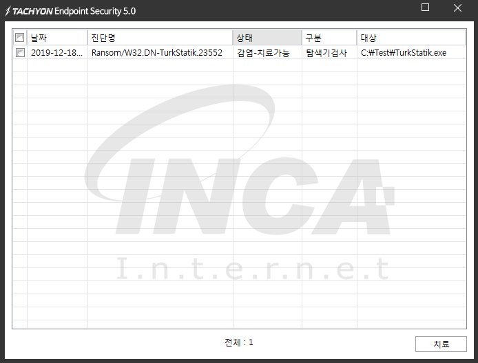 상기 악성코드는 잉카인터넷 안티바이러스 제품 TACHYON Internet Security 5.0에서 진단 및 치료가 가능하다.
