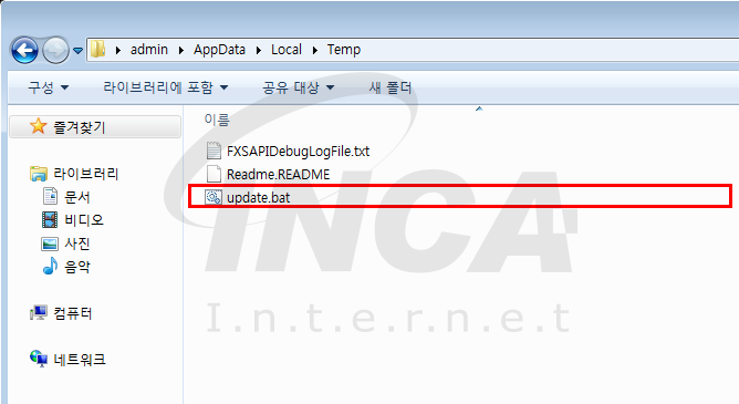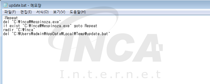 암호화가 완료된 후 ‘C:\Users\[사용자명]\AppData\Local\Temp’ 경로에 ‘update.bat’ 라는 이름의 배치파일을 드롭 한다.