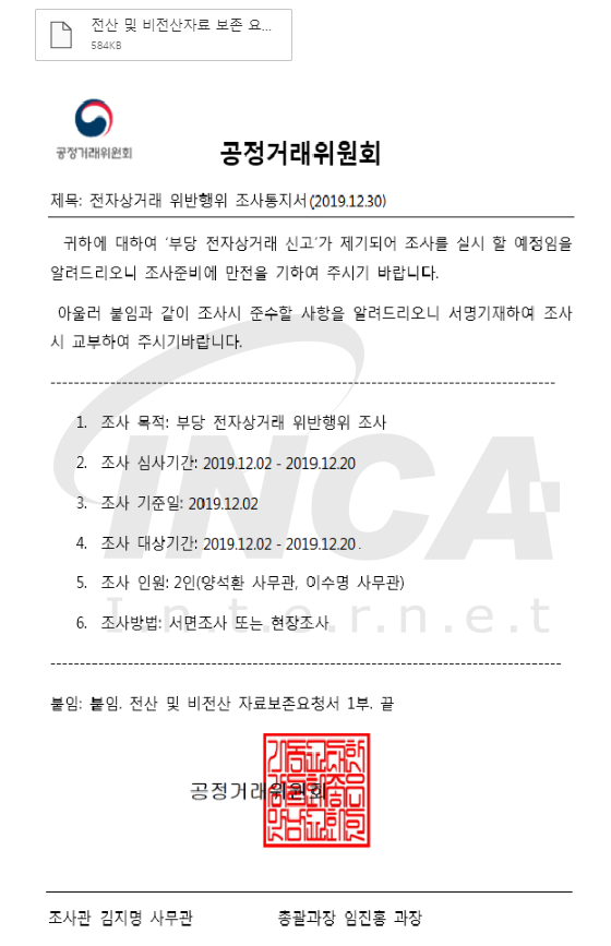 12월 30일, ‘공정거래위원회’를 사칭하여 Nemty 랜섬웨어가 유포 되었다. ‘전자상거래 위반행위 조사통지서’라는 제목으로 첨부파일을 포함한 스팸메일 형태였으며, 첨부 파일에는 Nemty v2.5 랜섬웨어를 포함하고 있었다. 보다 자세한 내용은 기존 잉카인터넷 공식 블로그에서 분석한 분석보고서를 참고 할 수 있다.