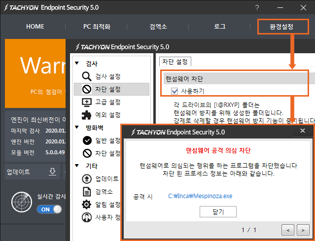 TACHYON Internet Security 5.0 에서 랜섬웨어 차단 기능 (환경설정-차단 설정-랜섬웨어 차단)을 이용하면 의심되는 파일 암호화 행위를 차단할 수 있다.
