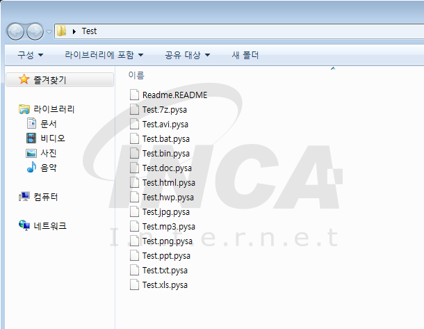 암호화 대상이 되는 파일을 찾아 암호화를 진행 한 후 아래 [그림 8] 과 같이 ‘.pysa’ 확장자를 추가한다. 또한 암호화가 완료된 폴더에 ‘Readme.README’ 라는 이름의 랜섬노트를 생성한다.